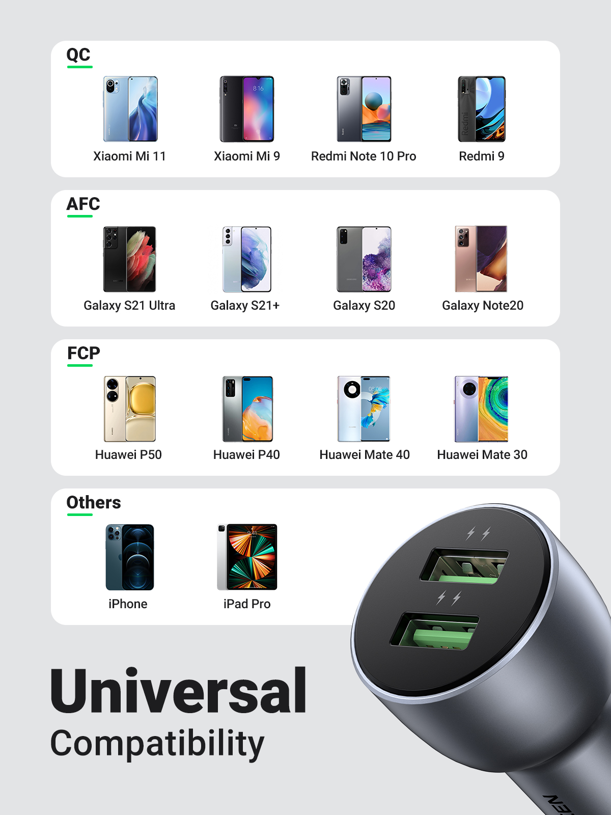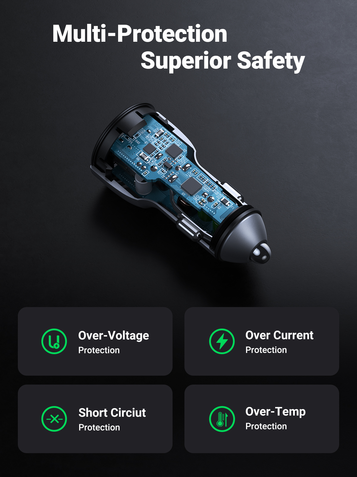 Din sikkerhet er vår høyeste prioritet. Denne hurtigladeren for bil har innebygde smarte brikker som automatisk detekterer den optimale strømmen for raskest mulig, men tryggest mulig, lading av enhetene dine. Med intelligent kretsdesign beskytter UGREEN billaderadapteren dine enheter mot: